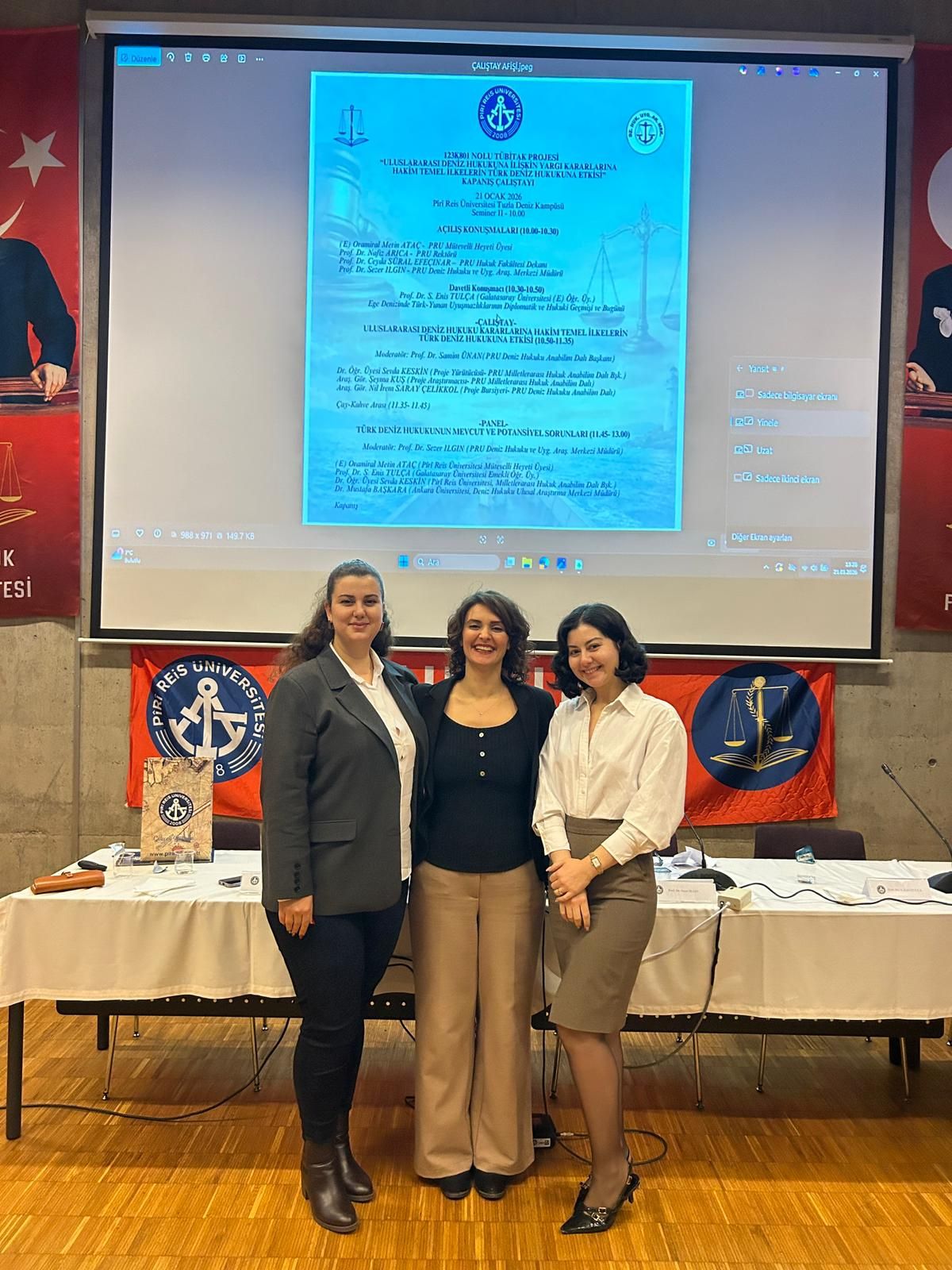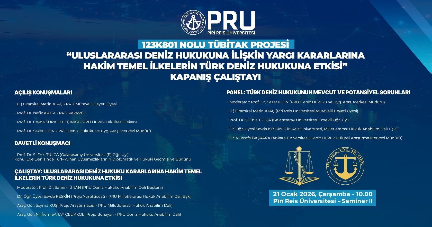 Dr. Öğr. Üyesi Sevda KESKİN’in yürütücülüğünde gerçekleştirilen “Uluslararası Deniz Hukukuna İlişkin Yargı Kararlarına Hakim Temel İlkelerin Türk Deniz Hukukuna Etkisi” başlıklı 123K801 Nolu Tübitak Projesi kapsamında ulaşılan sayısal ve akademik analizlerin paylaşıldığı ve tartışıldığı Kapanış Çalıştayı, 21 Ocak 2026 tarihinde Üniversitemiz Seminer II salonunda gerçekleştirilmiştir. Çalıştay kapsamında gerçekleştirilen konuşma ve bildirilerin yayınlandığı Kapanış Çalıştayı Kitabına aşağıdaki linkten ulaşılabilir.